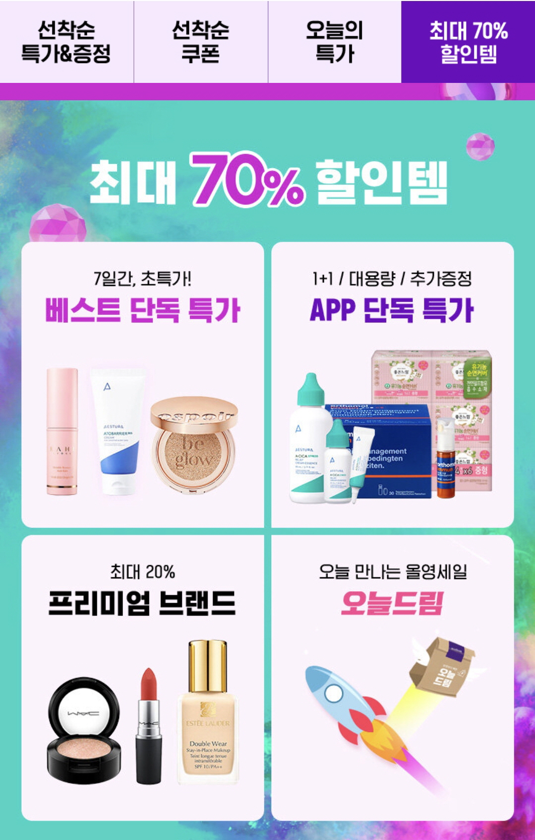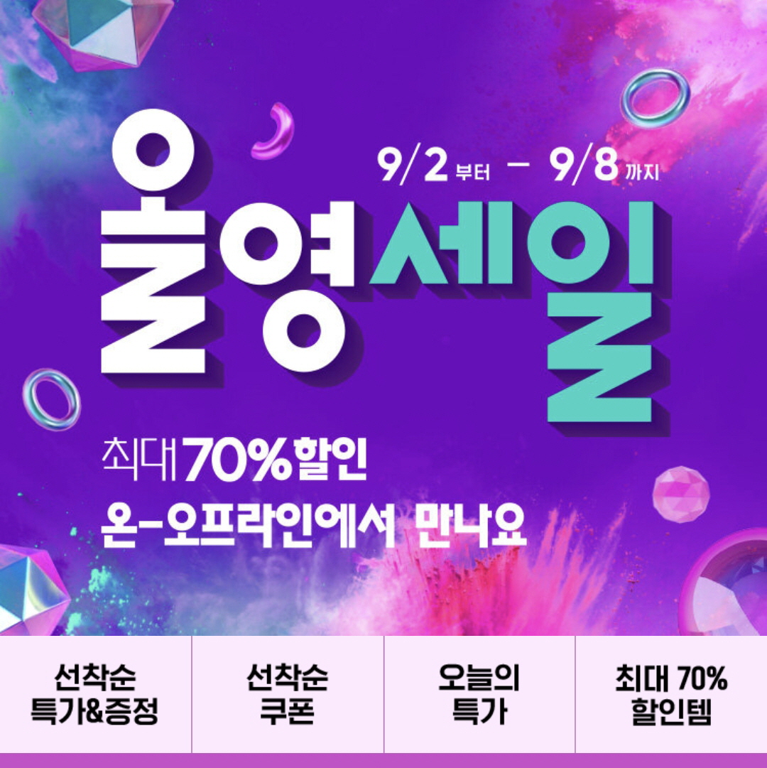 선착순 특가/증정 이벤트, 선착순 쿠폰 이벤트, 오늘의 특가, 최대 70% 할인템 등이 진행됩니다.