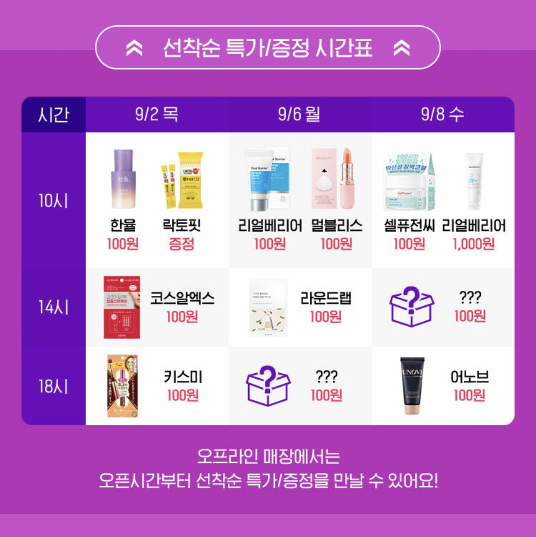 오프라인 매장에서는 오픈시간부터 선착순 특가/증정 이벤트를 만날 수 있습니다.