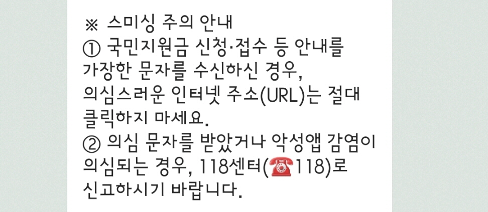 - 국민지원금 신청/접수 안내를 가장한 문자를 수신하신 경우, 의심스러운 인터넷 주소(URL)는 절대 클릭하지 마세요.