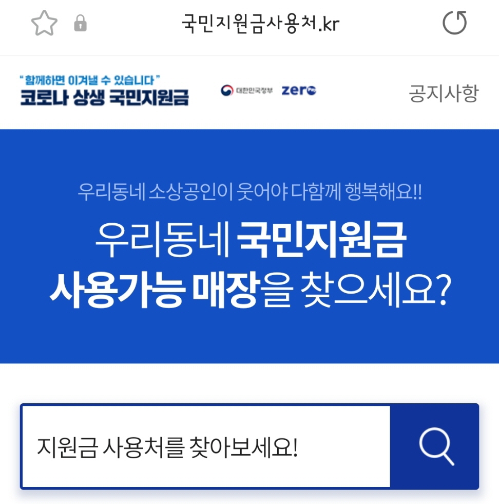 - 국민지원금 사용처는 위의 국민지원금사용처 사이트에서 검색하실 수 있습니다.