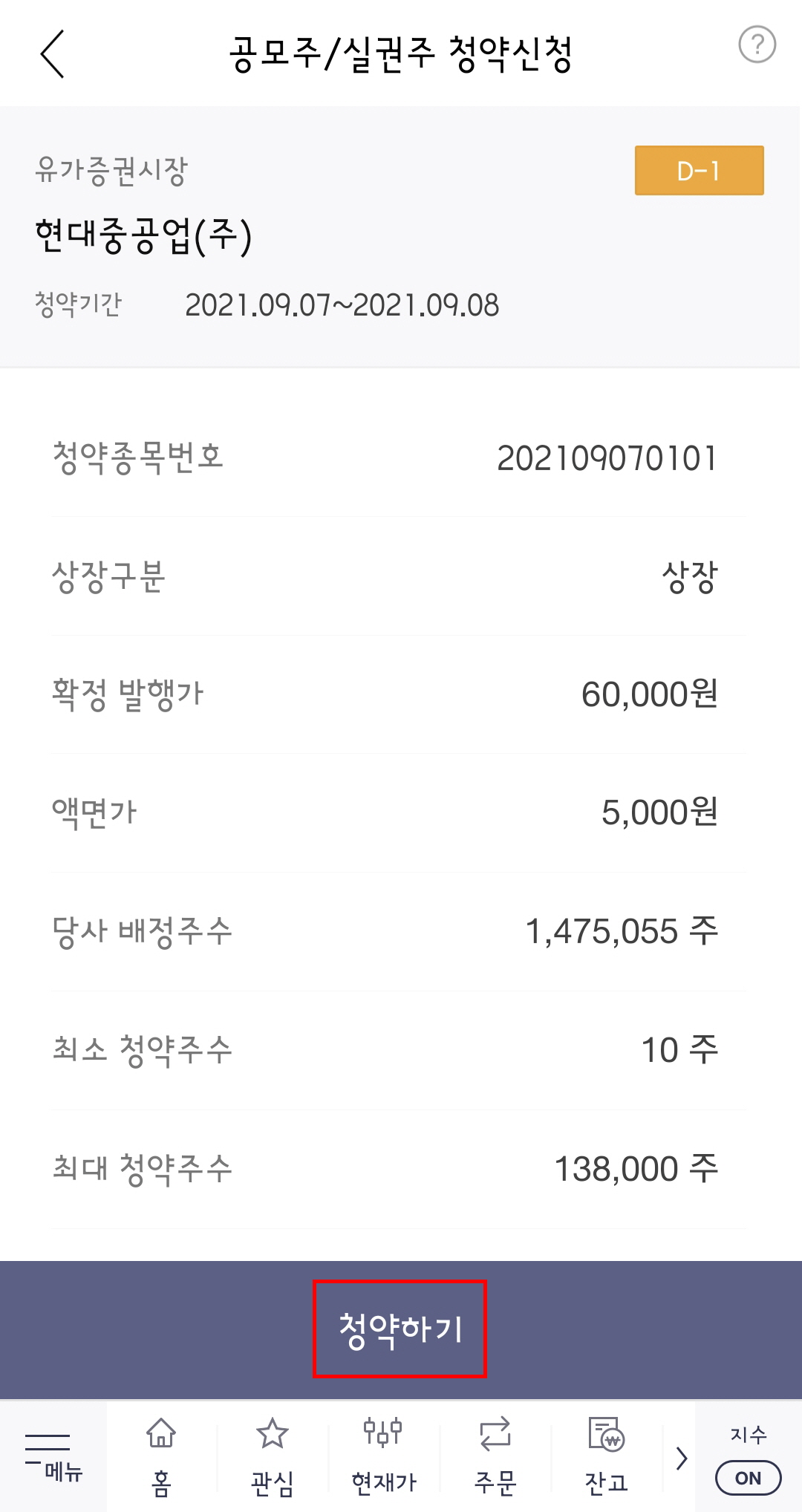 - 현대중공업 납입일은 9월 10일이었고 상장일은 9월 17일이었습니다. 청약 내용을 확인하고 제일 아래에 있는 청약하기를 클릭합니다.