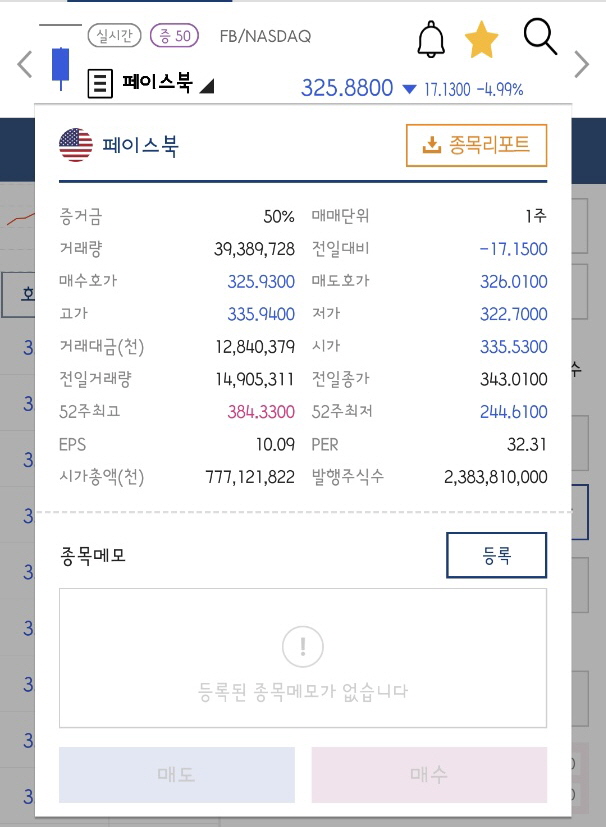 지난 장에서 종가 343.0100으로 마감했던 페이스북의 주가는 10월 5일 05시 30분 현재 325.7500으로 5%정도 하락장세를 보이며 파란색 그래프를 그리고 있습니다.