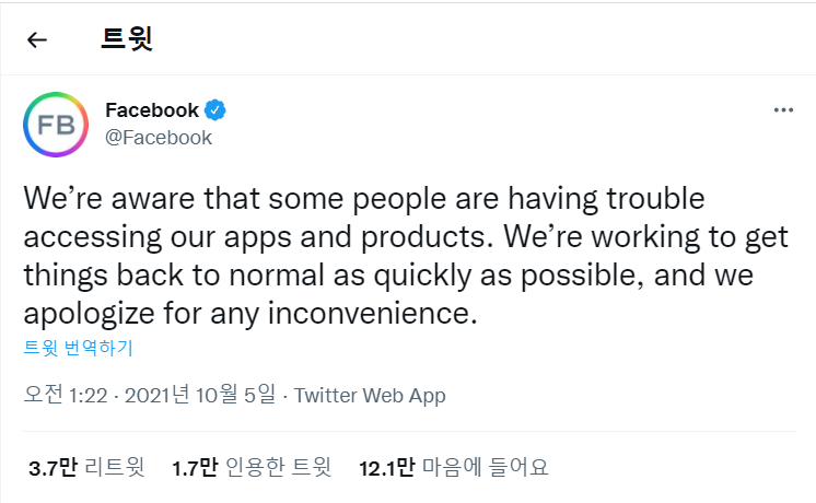 재미있게도 페이스북에서는 이와 같은 오류 현상에 대한 긴급 공지사항을 1시 22분쯤에 올렸는데요 페이스북이 먹통이 되었다는 이 긴급 공지사항을 경쟁사인 트위터를 통해 올려서 화제가 되기도 했습니다.