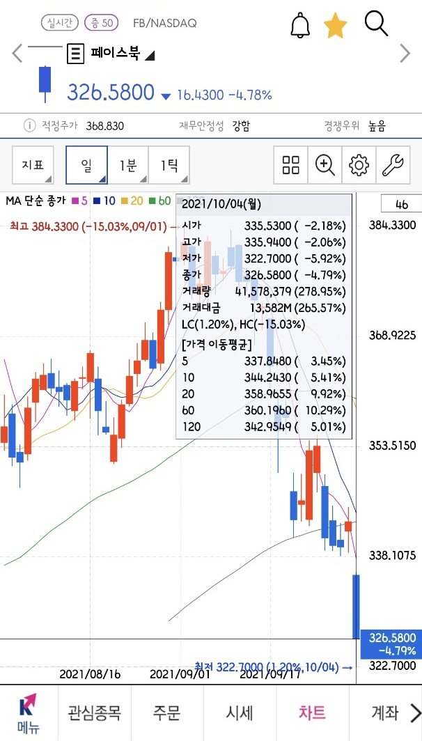 지난 장에서 종가 343.0100으로 마감했던 페이스북의 주가는 10월 5일 05시 30분 현재 325.7500으로 5%정도 하락장세를 보이며 파란색 그래프를 그리고 있습니다.