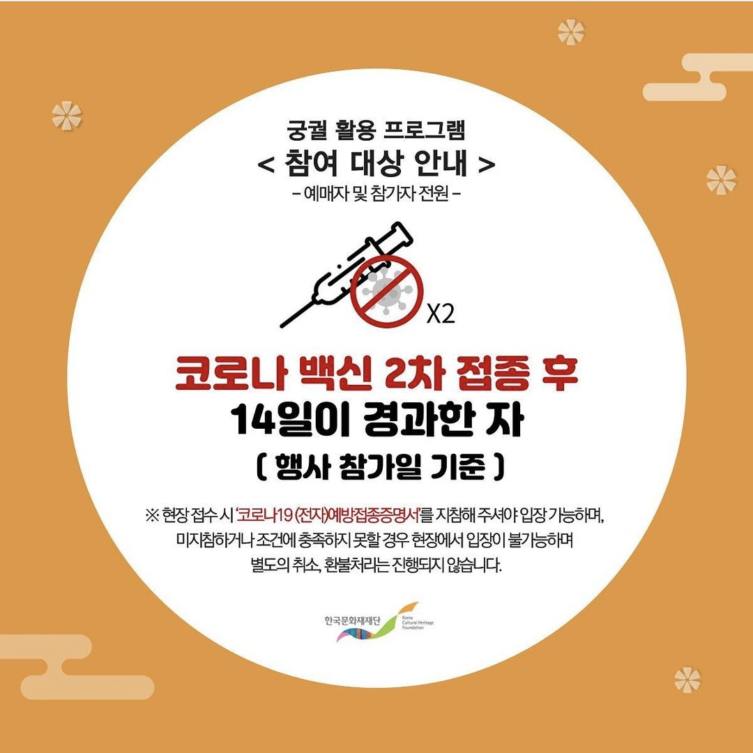한국문화재재단에서 운영하는 궁궐활용 프로그램의 예매는 접종 완료자를 중심으로 일상회복을 지원하는 정부 정책 방향에 따라, 코로나 백신 2차 접종 후 14일이 경과한 분만 가능합니다.