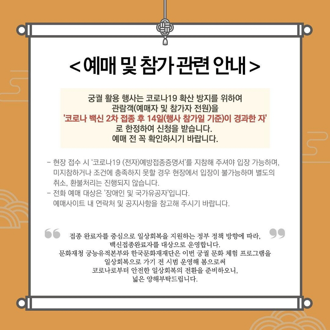 한국문화재재단에서 운영하는 궁궐활용 프로그램의 예매는 접종 완료자를 중심으로 일상회복을 지원하는 정부 정책 방향에 따라, 코로나 백신 2차 접종 후 14일이 경과한 분만 가능합니다.