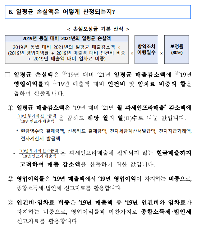 소상공인 손실보상금 일평균 손실액은 2019년 대비 2021년 일평균 매출감소액에 2019년 영업이익률과 2019년 매출액 대비 인건비 및 임차료 비중의 합을 곱하여 산출됩니다.