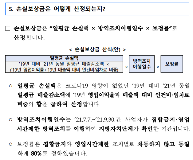 소상공인 손실보상금은 일평균 손실액 X 방역조치이행일수 X 보정률로 산정합니다.
