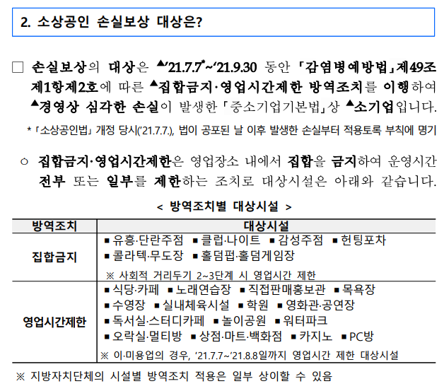 소상공인 손실보상 대상은 2021년 7월 7일부터 2021년 9월 30일까지 [감염병예방법] 제 49조 제1항 제1호에 따른 집합금지/영업시간제한 방역조치를 이행하여 경영상 심각한 손실이 발생한 [중소기업기본법]상 소기업입니다.