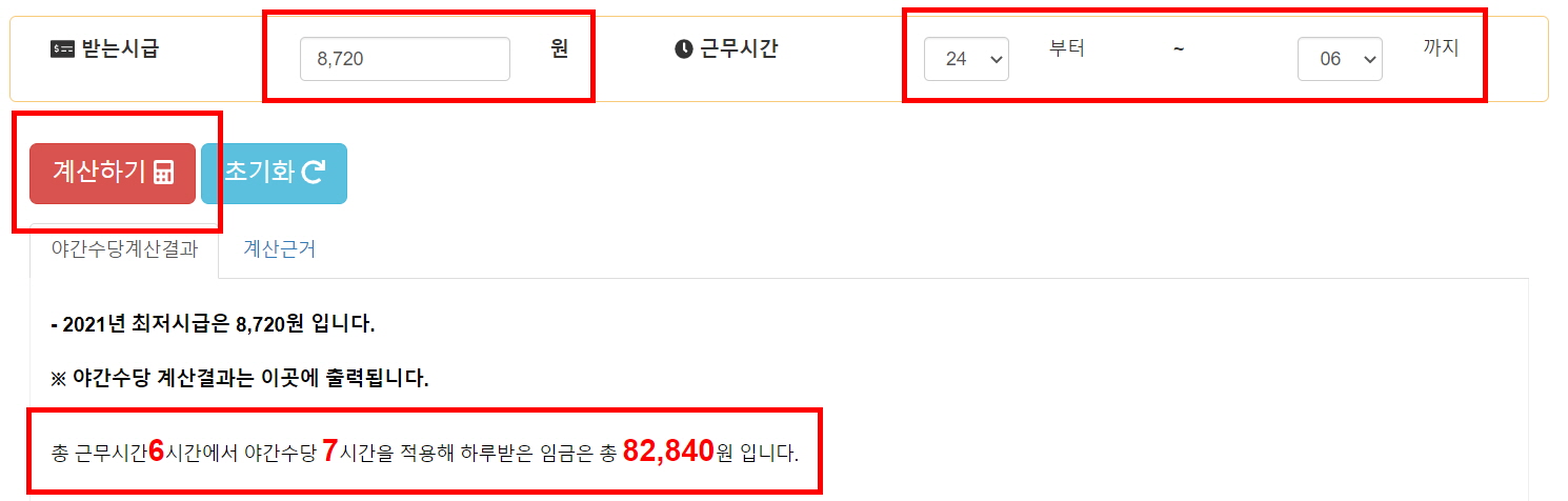 시급 8720원을 입력하고 근무시간을 밤 12시(24시)부터 아침 6시까지로 입력하고 계산하기를 클릭했더니 총 야근 근무시간 6시간에 야간수당은 82,840원으로 게산되었습니다.