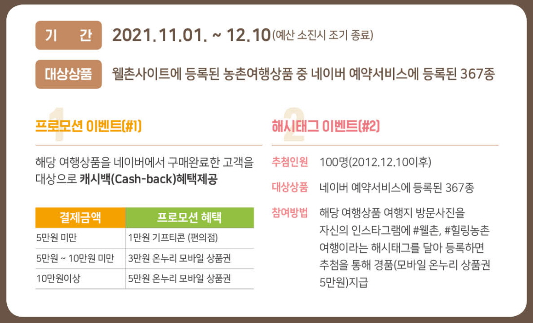 첫 번째 이벤트는 웰촌사이트에 등록된 농촌여행상품 중 네이버 예약 서비스에 등록된 367종의 여행상품에 대해 구매 완료한 고객을 대상으로 프로모션 캐시백 혜택을 제공하는 이벤트입니다.