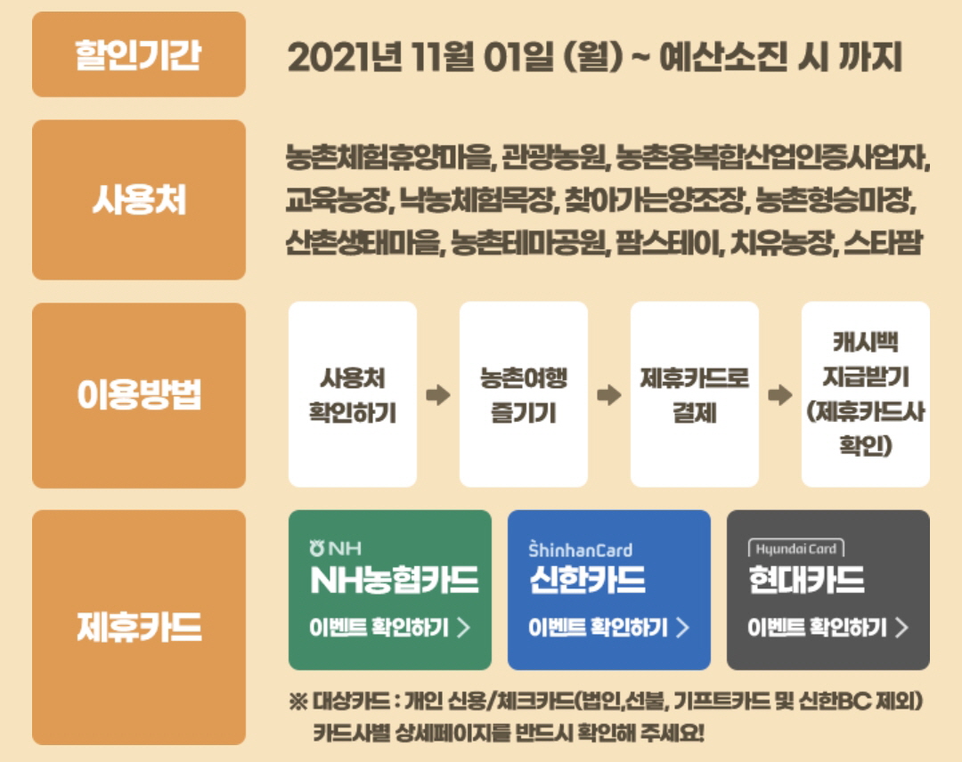 웰촌 사이트에서 선택한 슬기로운 농촌여행 여행지에서 제휴 카드로 결제하면 카드사에서 이용금액의 50%를 캐시백으로 돌려줍니다.(1인 최대 5만원)