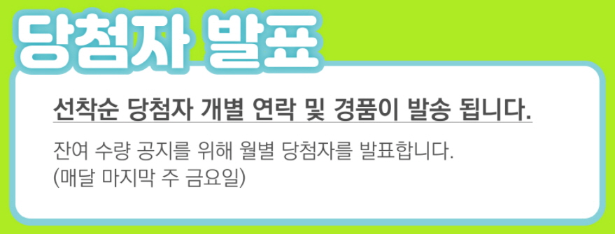 당첨자 발표는 선착순이며 매달 마지막 주 금요일에 당첨자를 발표합니다.