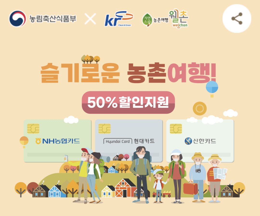 전국 1,700개 농촌여행지에서 제휴카드로 결제 시 50% 선착순 할인!