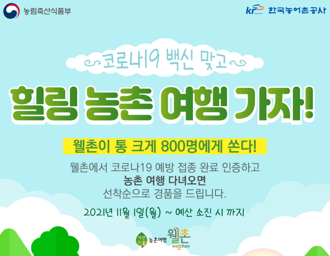 웰촌 홈페이지에서는 2021년 11월 1일부터 코로나19 백신 맞고 힐링 농촌 여행 가자! 경품 이벤트도 진행하고 있습니다.(예산 소진 시까지)