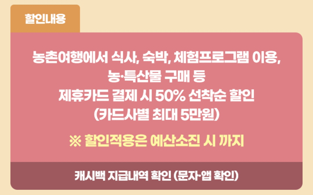 슬기로운 농촌여행 50% 할인 쿠폰은 농촌 여행에서의 식사, 숙박, 체험프로그램 이용, 농/특산물 구매 등을 이용 시에 제휴카드로 결제하면 결제 금액에 대해 선착순으로 50% 할인을 해주는 방식으로 진행됩니다.