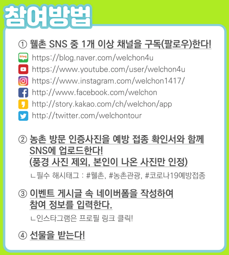 | ② 농촌 방문 인증사진을 예방 접종 확인서와 함께 SNS에 업로드 한다! (풍경 사진 제외, 본인이 나온 사진만 인정) - 필수 해시태그 #웰촌 #농촌관광 #코로나19예방접종 |