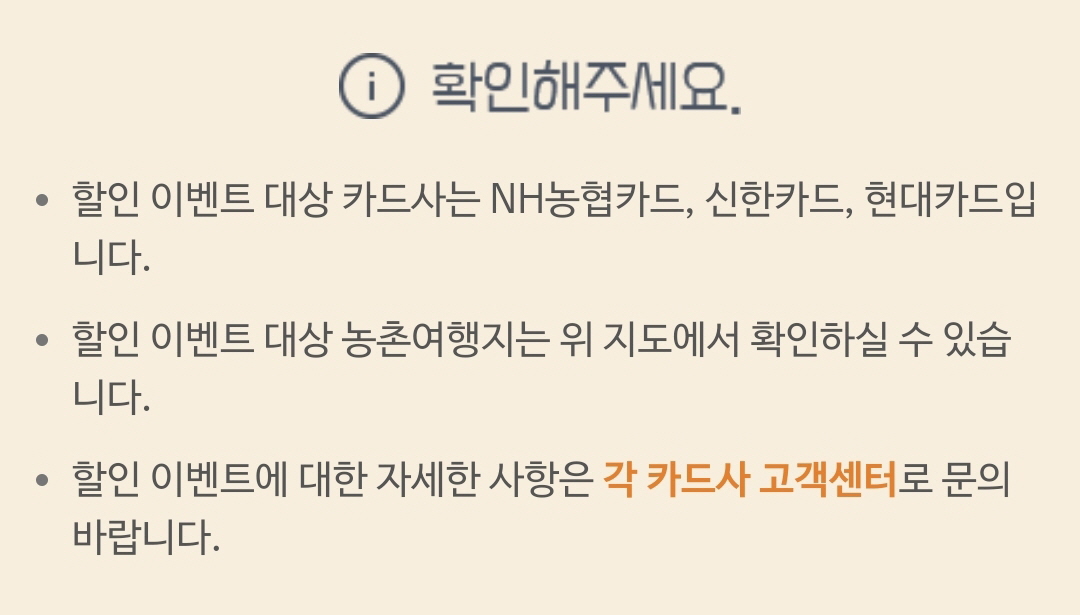 우선 슬기로운 농촌여행 할인 이벤트 페이지에 들어가서 아래와 같이 사용처를 먼저 확인합니다.