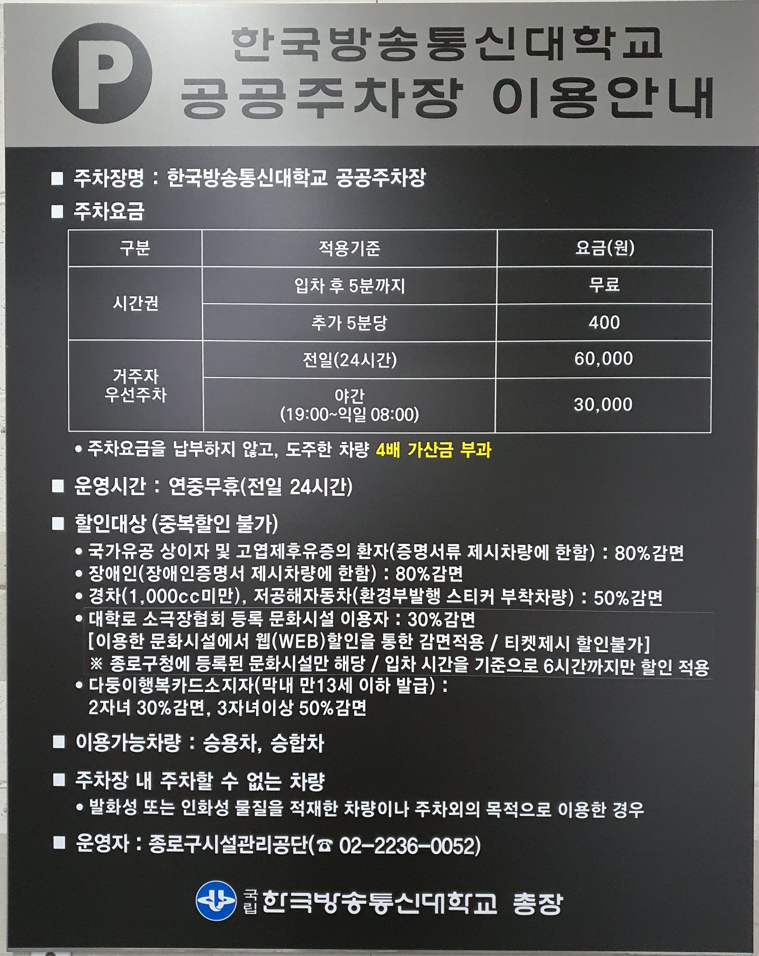 한국방송통신대학교 공공주차장 이용정보와 할인정보를 간단하게 알아보겠습니다.