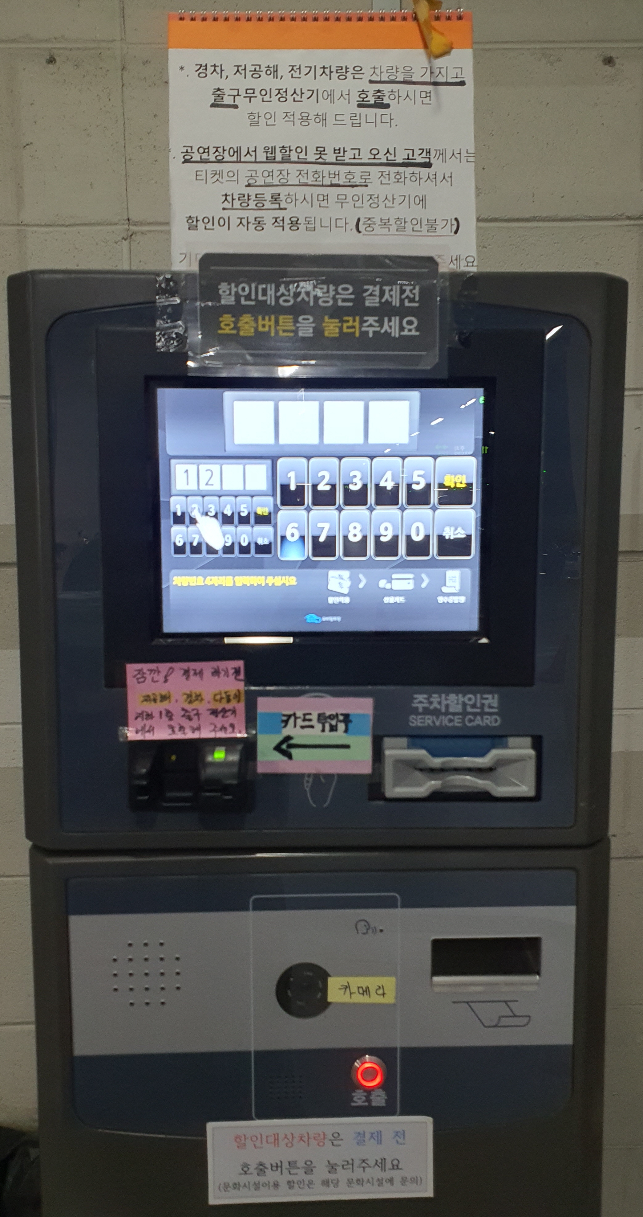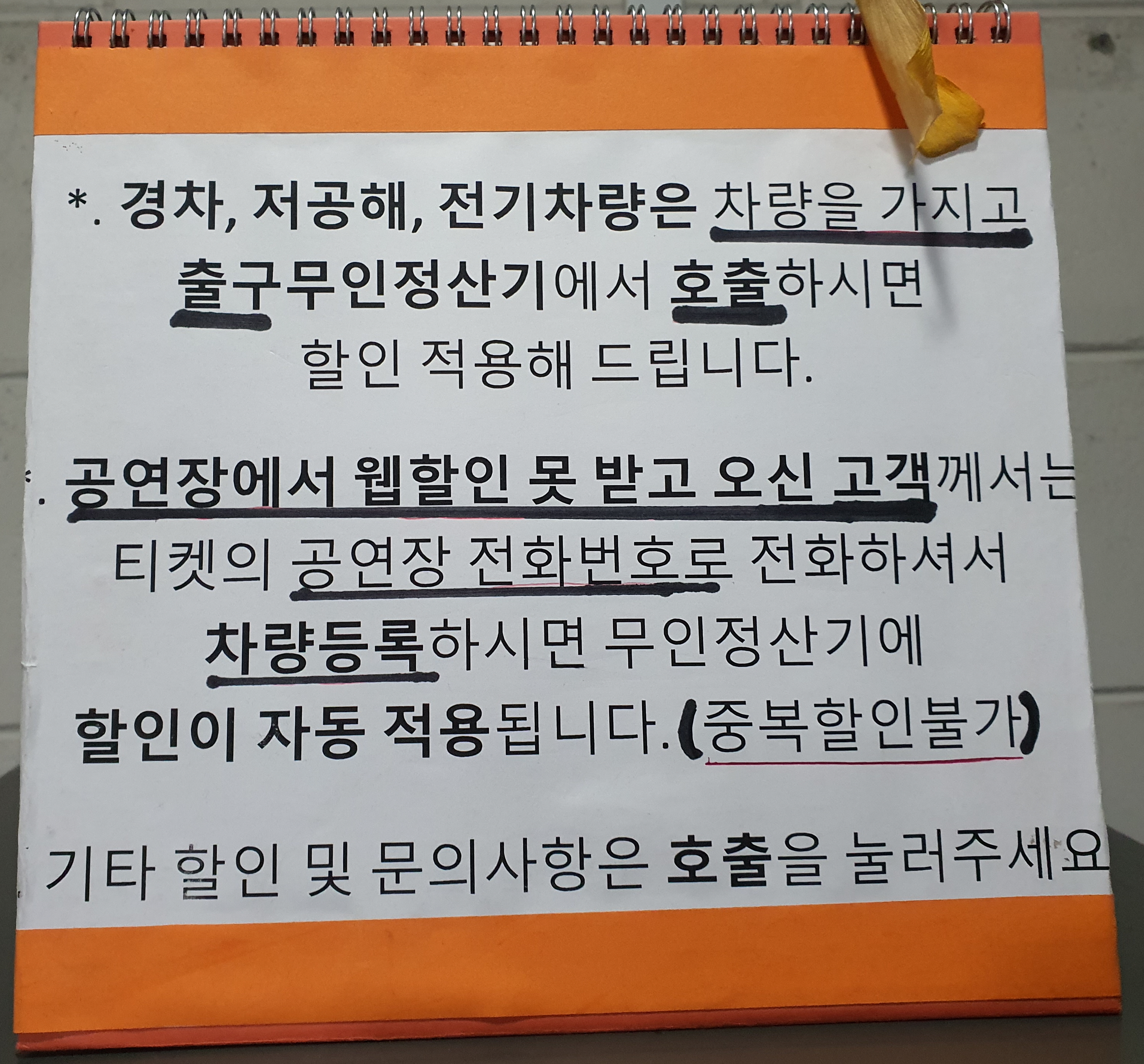 공연장에서 웹할인을 못 받고 온 경우 티켓의 공연장 전화번호로 전화해서 차량 주차등록을 요청하시면 무인정산기에서 할인이 자동적용됩니다.(중복할인불가)