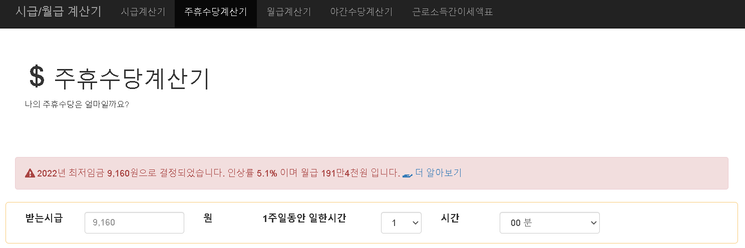 시급계산기, 월급계산기, 야간수당계산기, 주휴수당계산기
