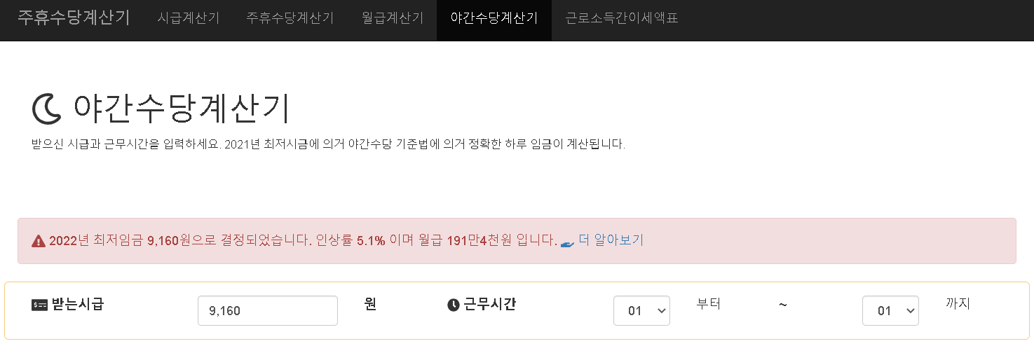 야간수당 계산기에서는 받는시간과 근무시간을 입력하면 야간수당을 계산해볼 수 있습니다.