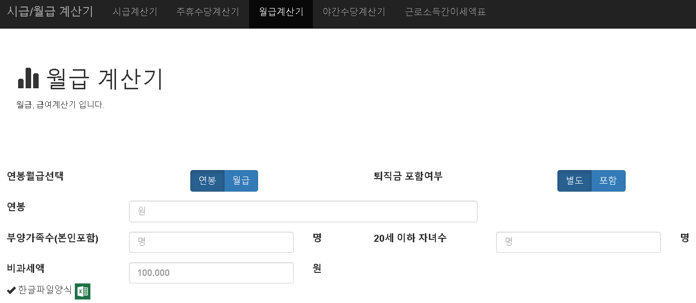 바로 시급/월급계산기 사이트입니다. 위의 링크 주소를 클릭하면 시급계산기, 월급계산기, 연봉계산기, 야간수당계산기, 주휴수당 계산기를 무료로 이용할 수 있습니다.