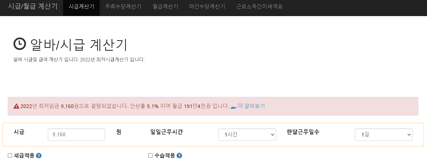 바로 시급/월급계산기 사이트입니다. 위의 링크 주소를 클릭하면 시급계산기, 월급계산기, 연봉계산기, 야간수당계산기, 주휴수당 계산기를 무료로 이용할 수 있습니다.