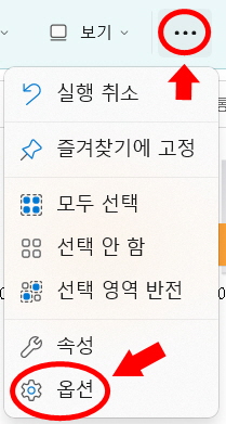 폴더 제일 오른쪽 상단을 보면 위의 그림과 같이 <점 3개 아이콘>이 있습니다. 클릭하고 위의 그림과 같이 제일 마지막 메뉴인 톱니바퀴 아이콘의 <옵션>을 다시 클릭해줍니다.