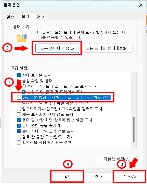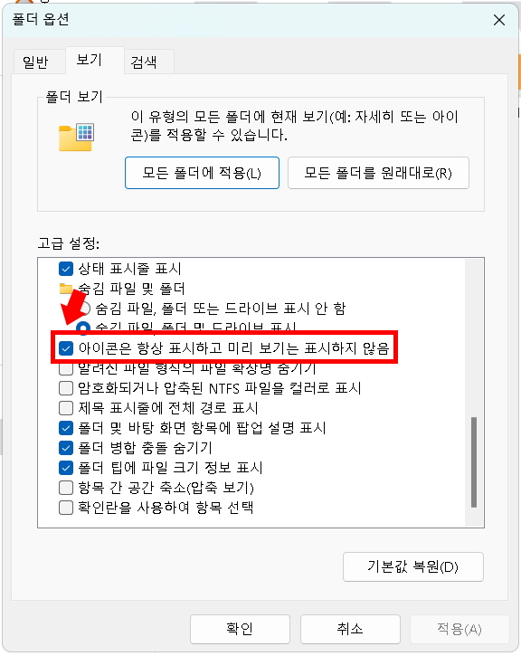 1. <아이콘은 항상 표시하고 미리 보기는 표시하지 않음> 메뉴 체크박스에 체크를 해제해 줍니다.