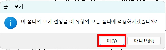 2. <모든 폴더에 적용> 메뉴를 클릭해 주면 아래와 같은 팝업창이 나타납니다. <예>를 클릭합니다.