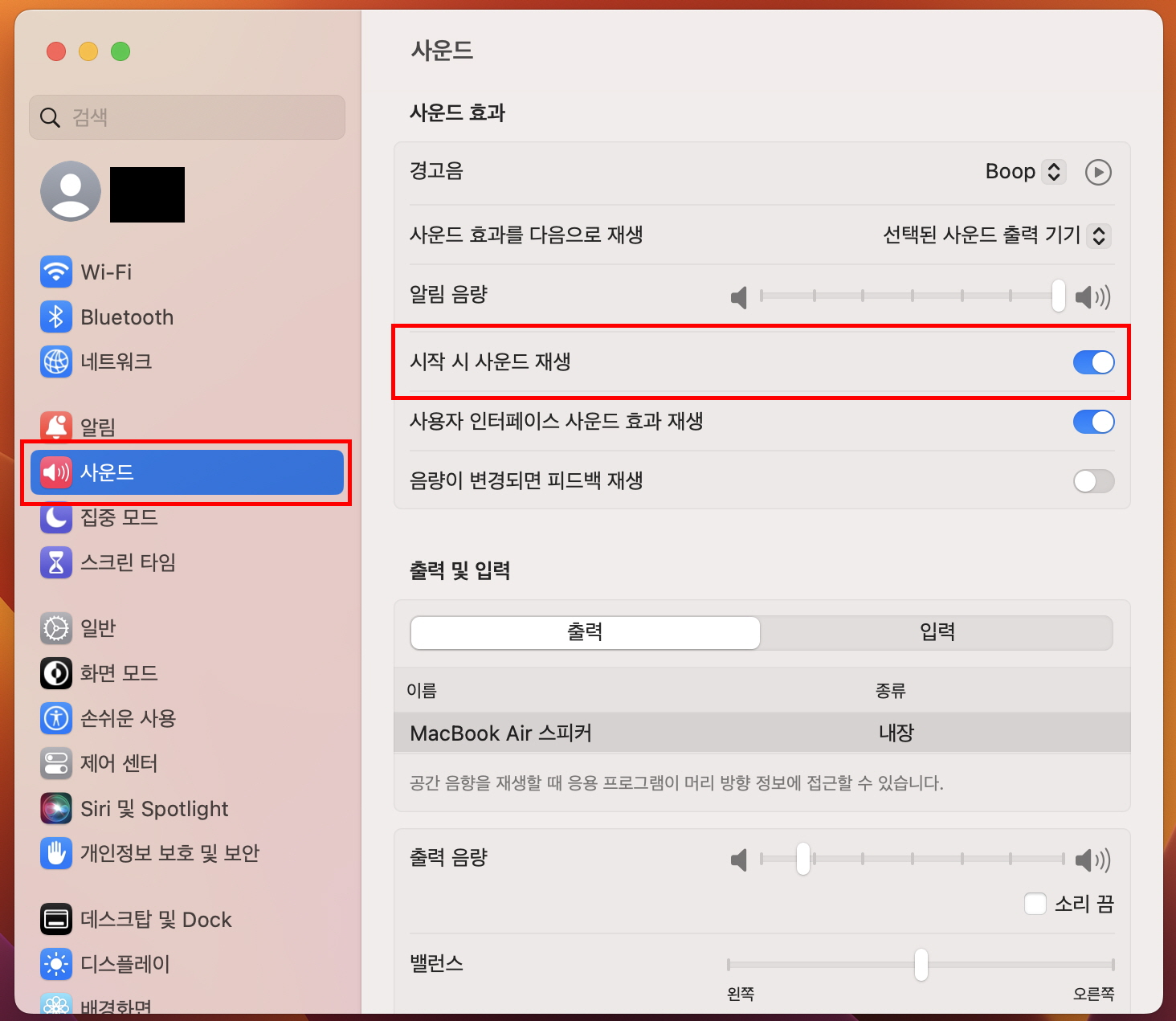 두번째, <시스템 설정> 메뉴 안에 있는 <사운드> 메뉴를 클릭하면 오른쪽 하위 메뉴에 <시작 시 사운드 재생> 메뉴가 활성화 되어 있는것을 수 있습니다.
