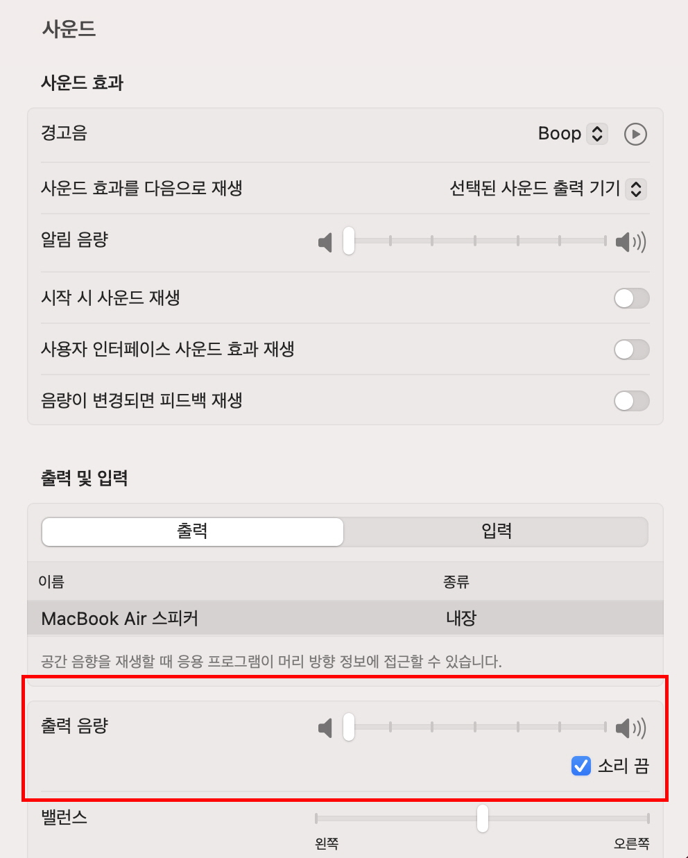 맥북의 스피커의 <출력 음량> 조절도 <사운드> 메뉴에서 음량을 조절할 수 있고 <소리 끔> 체크박스를 체크하면 소리가 나지않게 끌 수도 있습니다.