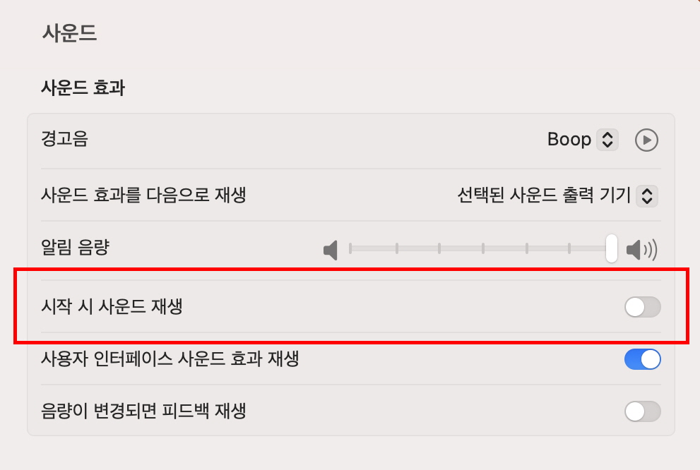 세번째, <시작 시 사운드 재생> 메뉴를 클릭해서 비활성화 해주면 맥북 시작시에 크게 울리는 맥북 에어 시작음을 끌 수 있습니다.