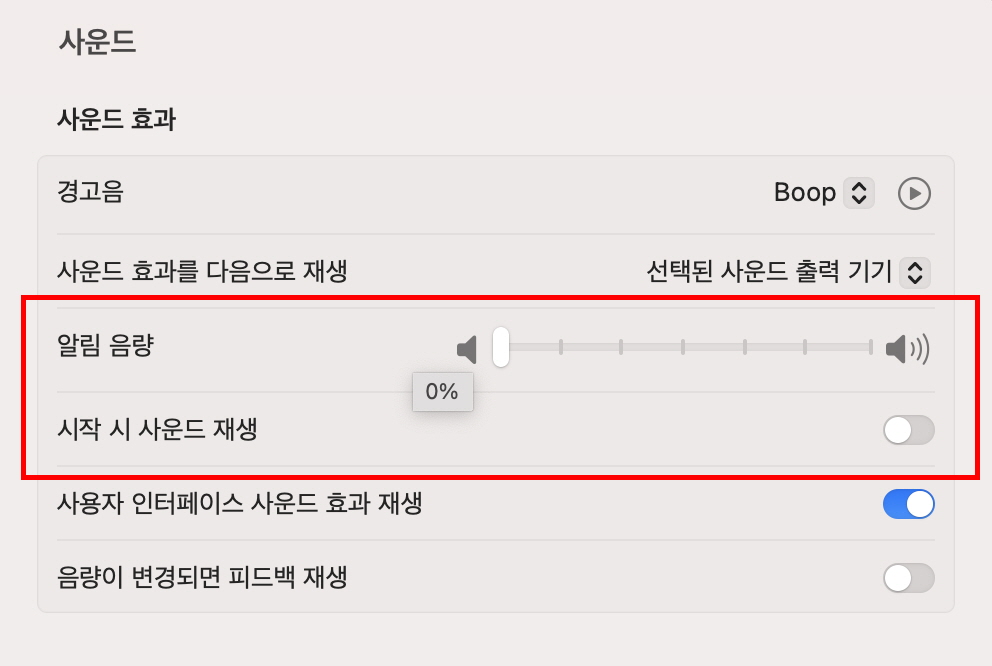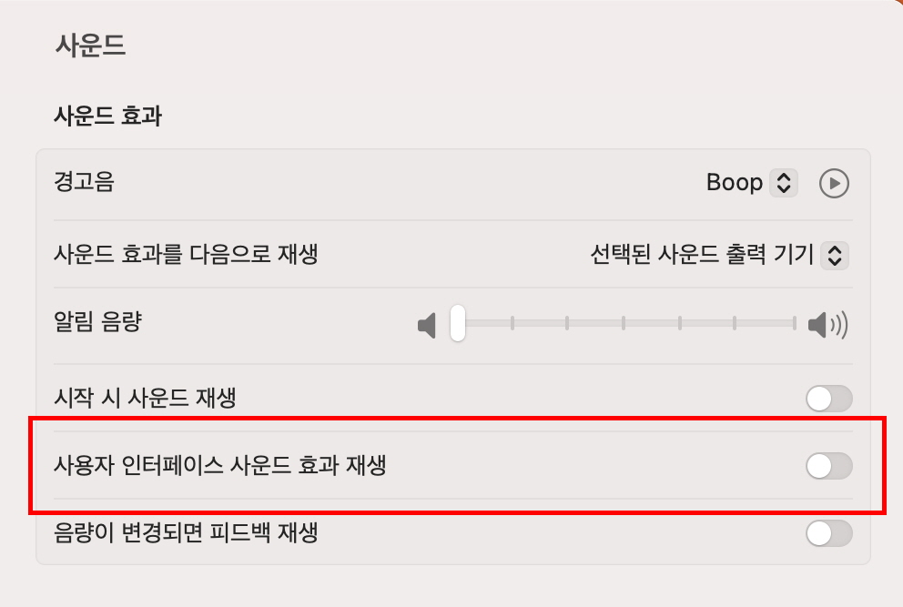 맥북의 <사용자 인터페이스 사운드 효과 재생>도 <사운드> 메뉴에서 소리가 나지않게 끌 수 있습니다.