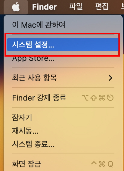 첫번째, 맥북 전원을 켜고 제일 왼쪽 상단에 있는 애플 로고를 클릭한 다음 <시스템 설정> 메뉴를 클릭합니다.