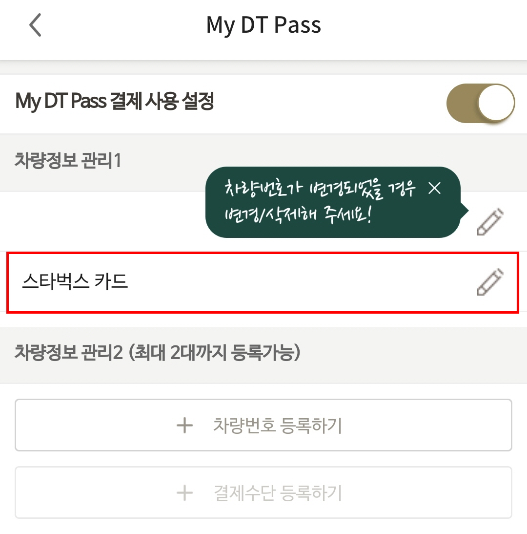 My DT Pass 메뉴에서는 등록된 차량에 연결된 스타벅스 카드 변경도 가능하니 참고하시기 바랍니다.