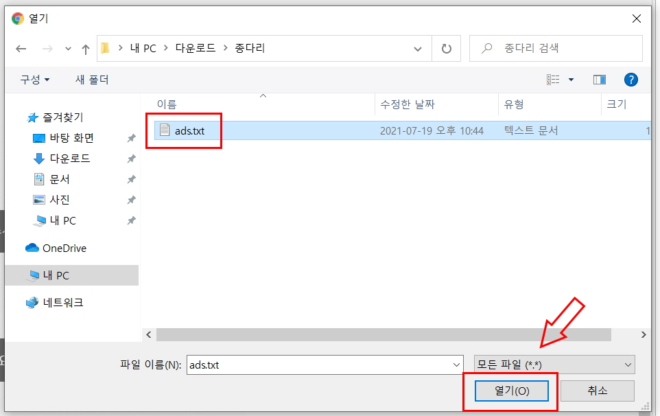 이제 아까 다운로드 받았던 ads.txt 파일을 선택하고 열기 버튼을 눌러 업로드해 줍니다.