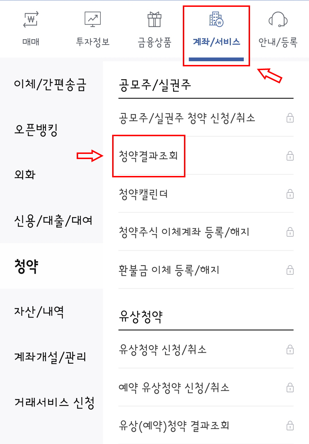 최근 메뉴에 청약결과조회 메뉴가 없다면 위에 있는 메뉴중 계좌/서비스 메뉴를 선택 후 한국투자증권 청약결과조회 메뉴를 눌러주면 됩니다.
