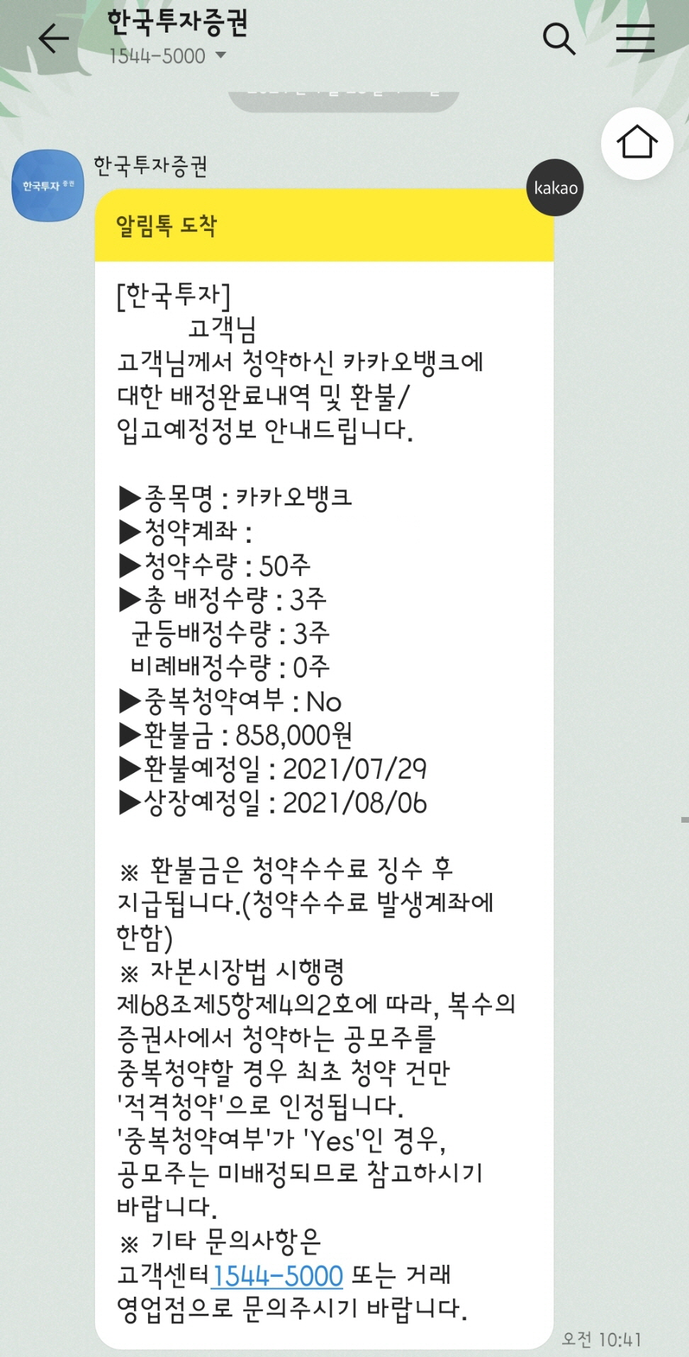어쨌든 7월 26일에 청약을 신청하고 7월 29일에 결과가 나오는 일정이라서 생각없이 기다리고 있었는데요 7월 28일인 오늘 오전에 한국투자증권에서 카카오톡 알림이 왔습니다.