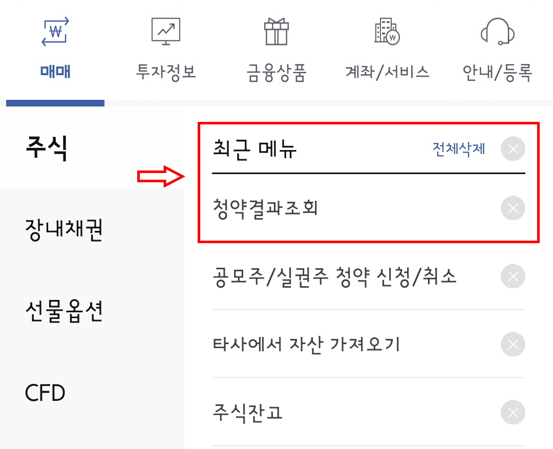 저는 청약 당일에 청약결과 조회를 해봤기 때문에 최근메뉴에 이렇게 바로 한국투자증권 청약결과조회 메뉴가 떴습니다.