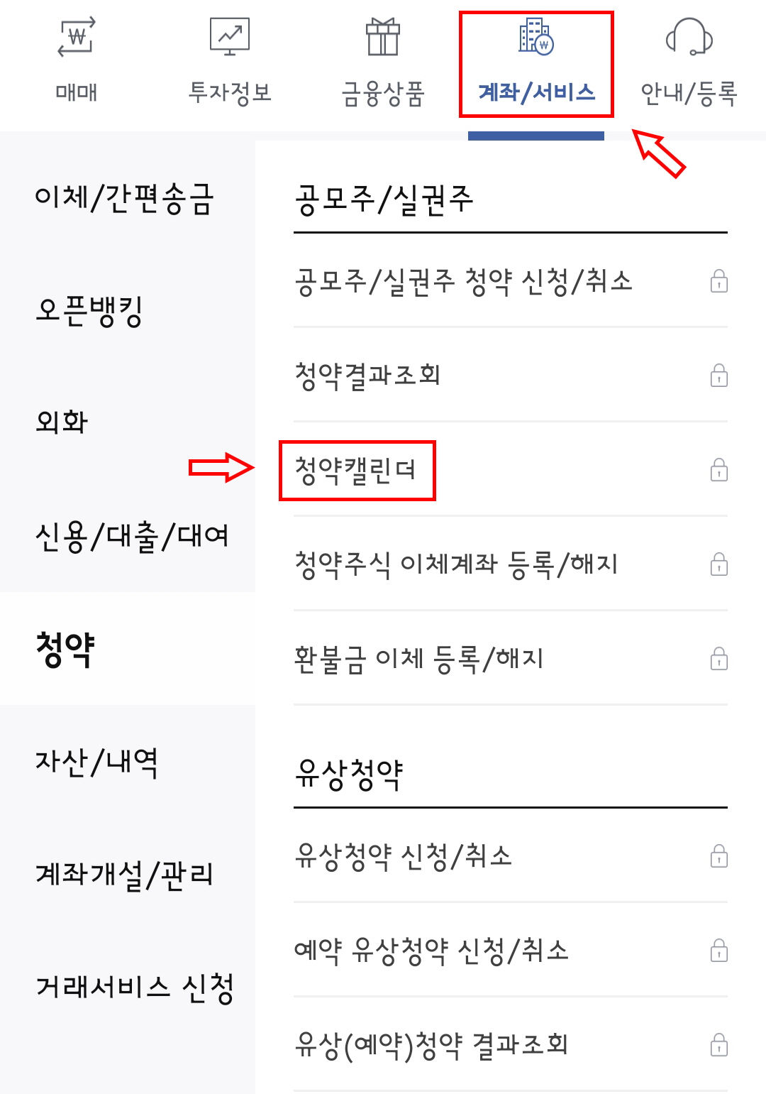 최근 메뉴에 청약결과조회 메뉴가 없다면 위에 있는 메뉴중 계좌/서비스 메뉴를 선택 후 한국투자증권 청약결과조회 메뉴를 눌러주면 됩니다.