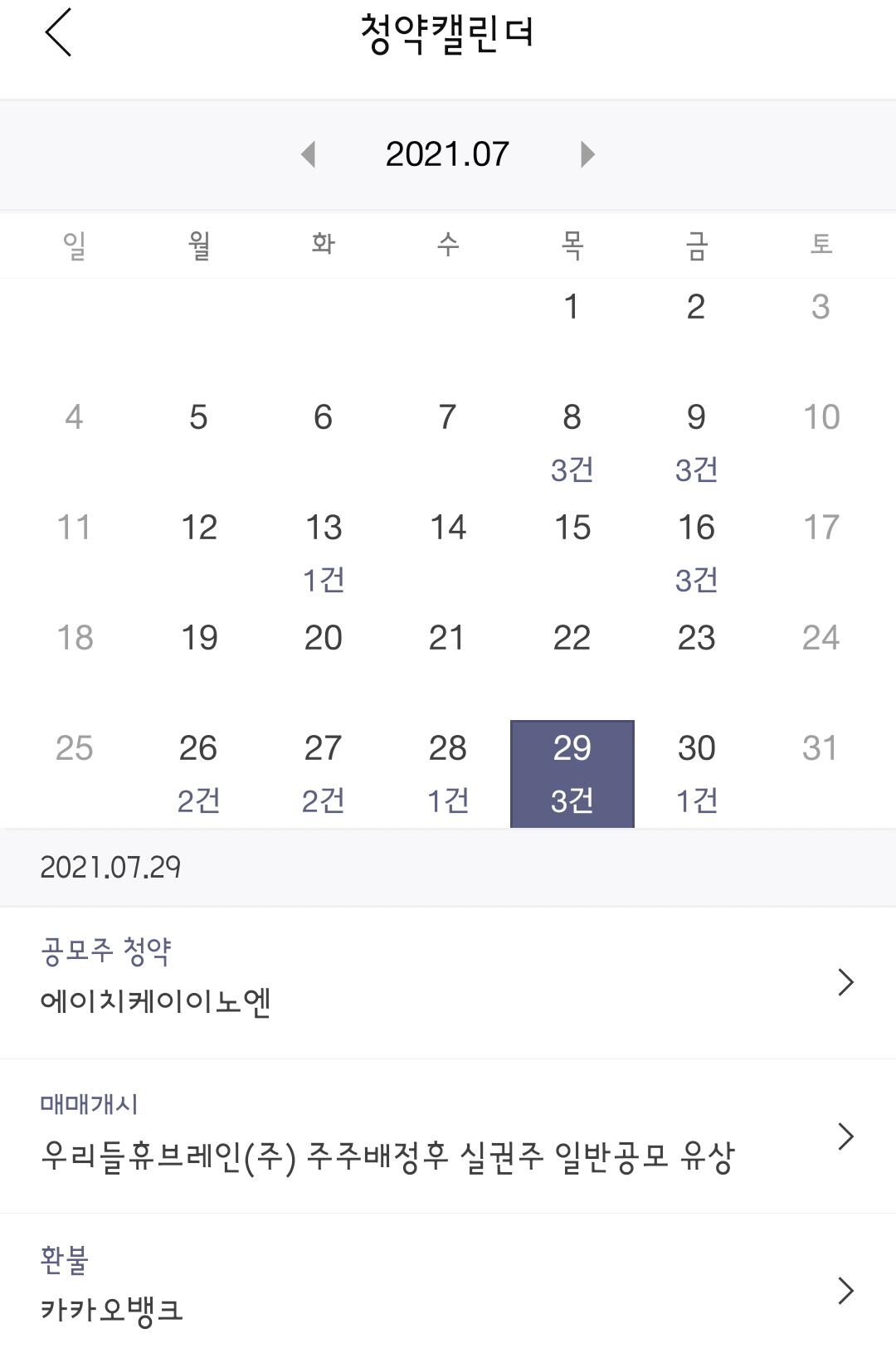 한국투자증권 청약캘린더에는 이렇게 날짜별로 청약 관련 일정들이 나와있습니다. 7월 29일 청약 관련된 일정은 에이치케이이노엔 공모주 청약일정과 우리들휴브레인(주) 주주배정후 실권주 일반공모 유상 매매개시 일정, 카카오뱅크 환불 일정이 있다고 합니다.
