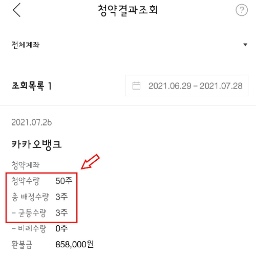 와우! 7월 29일에 결과가 나온다더니 하루 빠른 7월 28일 오전에 결과를 바로 알려줬습니다. 저는 균등배정으로 3주 배정을 받았습니다. KB증권으로 청약을 넣은 분들은 5주를 배정받았다고 하는데요 증권사별로 배정된 주수가 달라서 개인들에게 배정되는 균등주수도 다른가봅니다. KB증권 계좌를 만들었어야 했나봅니다. ㅋㅋ 제 비례배정 수량은 0주입니다. 나머지 금액은 7월 29일에 환불된다고 하고 상장예정일은 8월 6일이라고 합니다.
