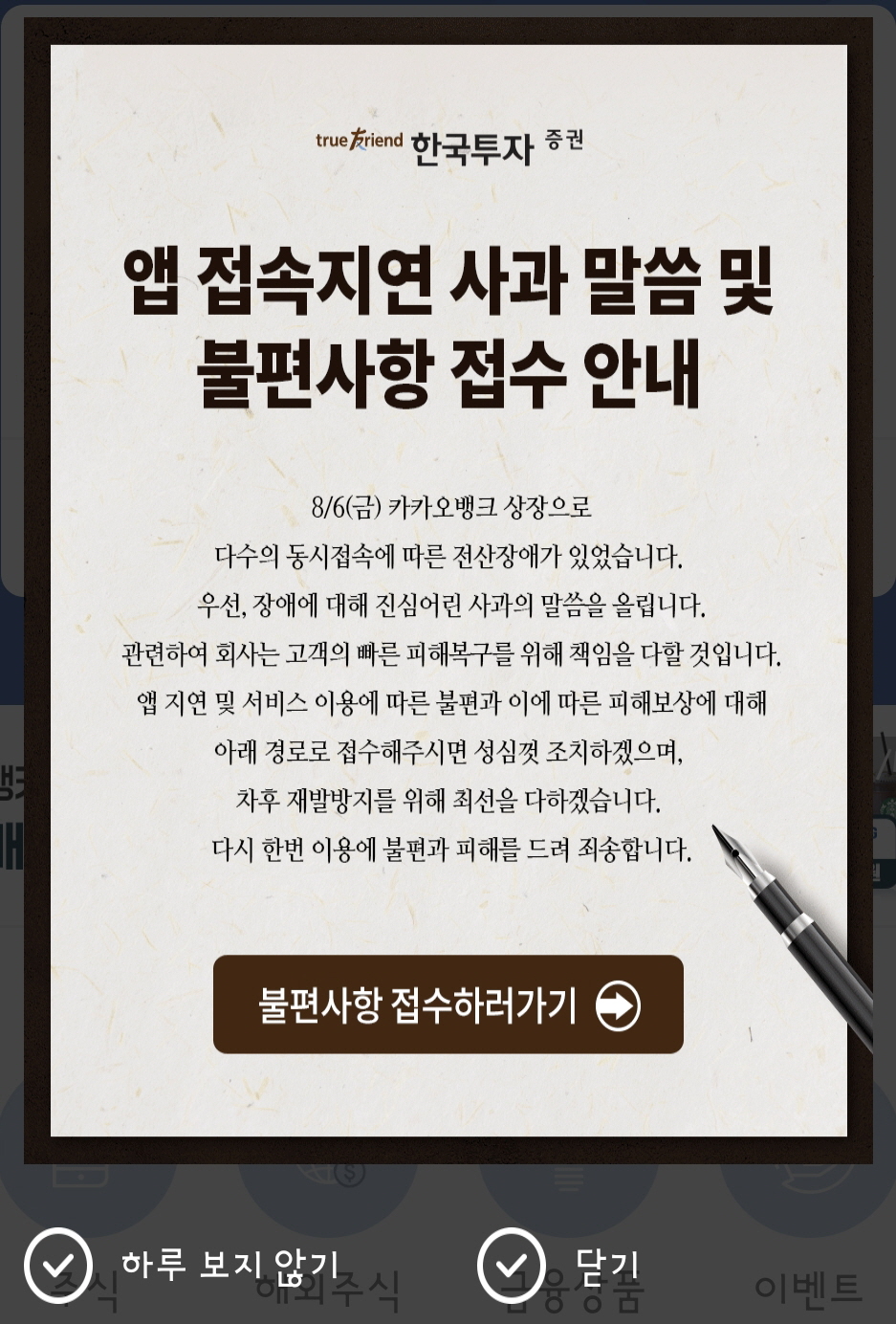 한국투자증권 앱에 접속하니 이런 사과 안내문이 있었습니다. 저는 그냥 닫기를 눌렀습니다.