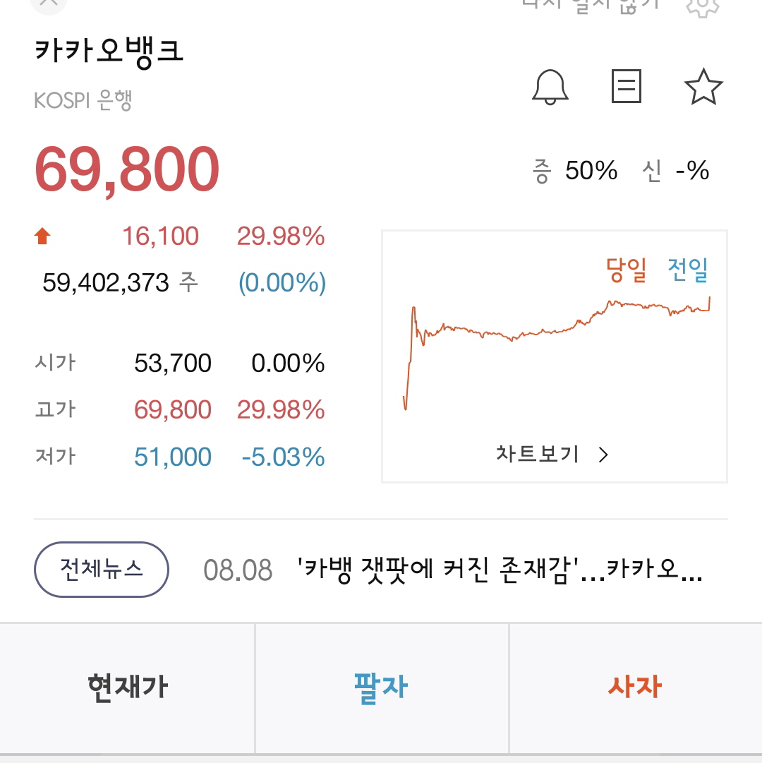 공모주는 상장 첫날 공모주의 시초가가 형성되는데 공모주의 시초가는 공모가의 90~200% 범위 내에서 정해지게 됩니다. 100% 이상이 시초가를 형성한 상태에서 상한가를 가는 경우를 따상이라고 하는데 카카오뱅크는 첫날 따상에는 실패했습니다. 하지만 상한가로 장을 마감하면서 금융 대장주로 올라갔다는 기사가 나왔습니다.