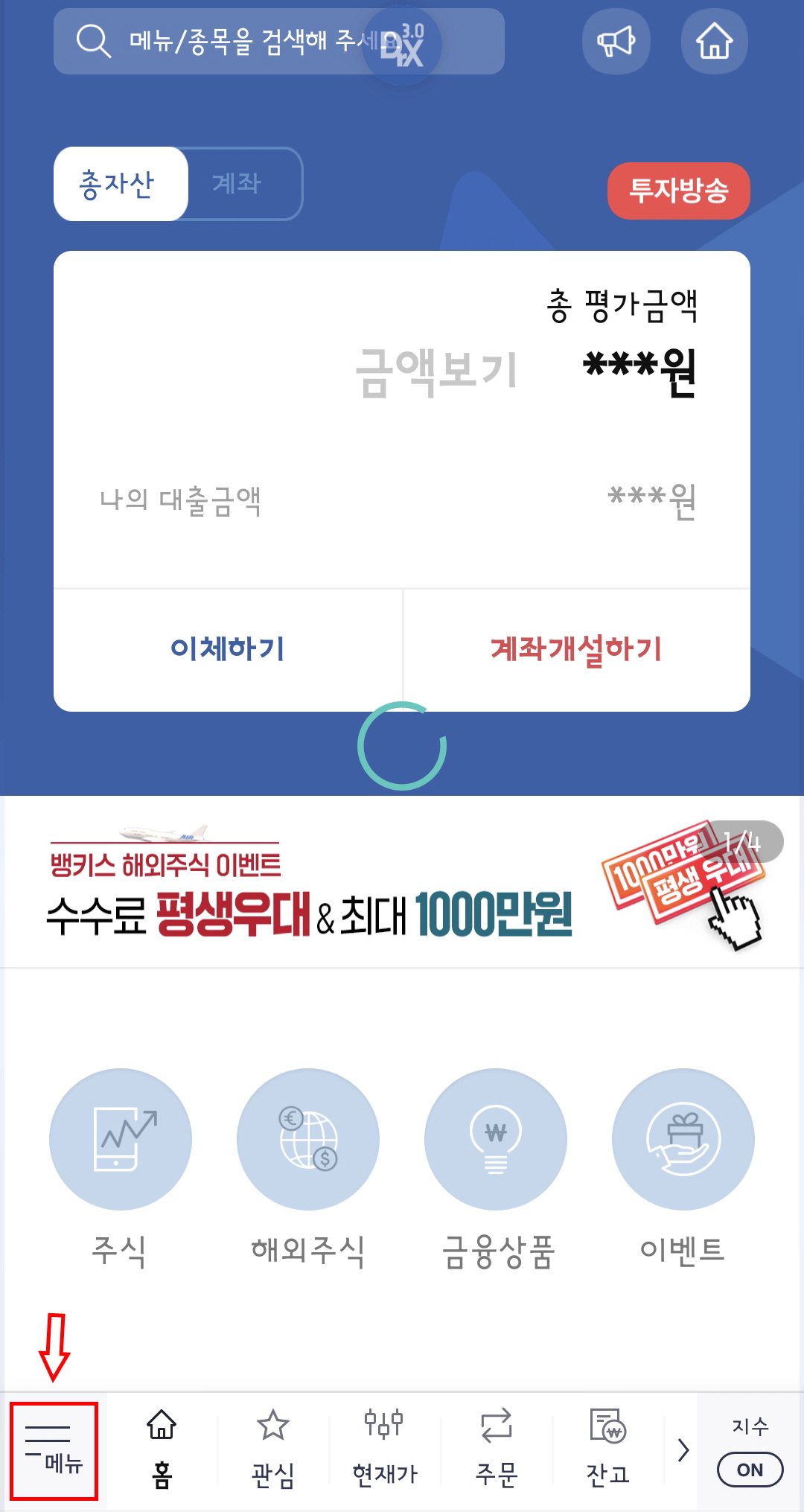 한국투자증권 앱은 저도 카카오뱅크 주식계좌 만들기 이벤트때 만들어놓고 한번도 사용하지를 않아서 사용법을 잘 몰라서 주식잔고를 어떻게 봐야하는지 조금 헤맸습니다. 한국투자증권 앱에서 주식잔고를 확인하려면 홈 화면에서 메뉴를 누른 다음 매매 -> 주식 -> 주식잔고의 순서대로 메뉴를 눌러주면 됩니다.