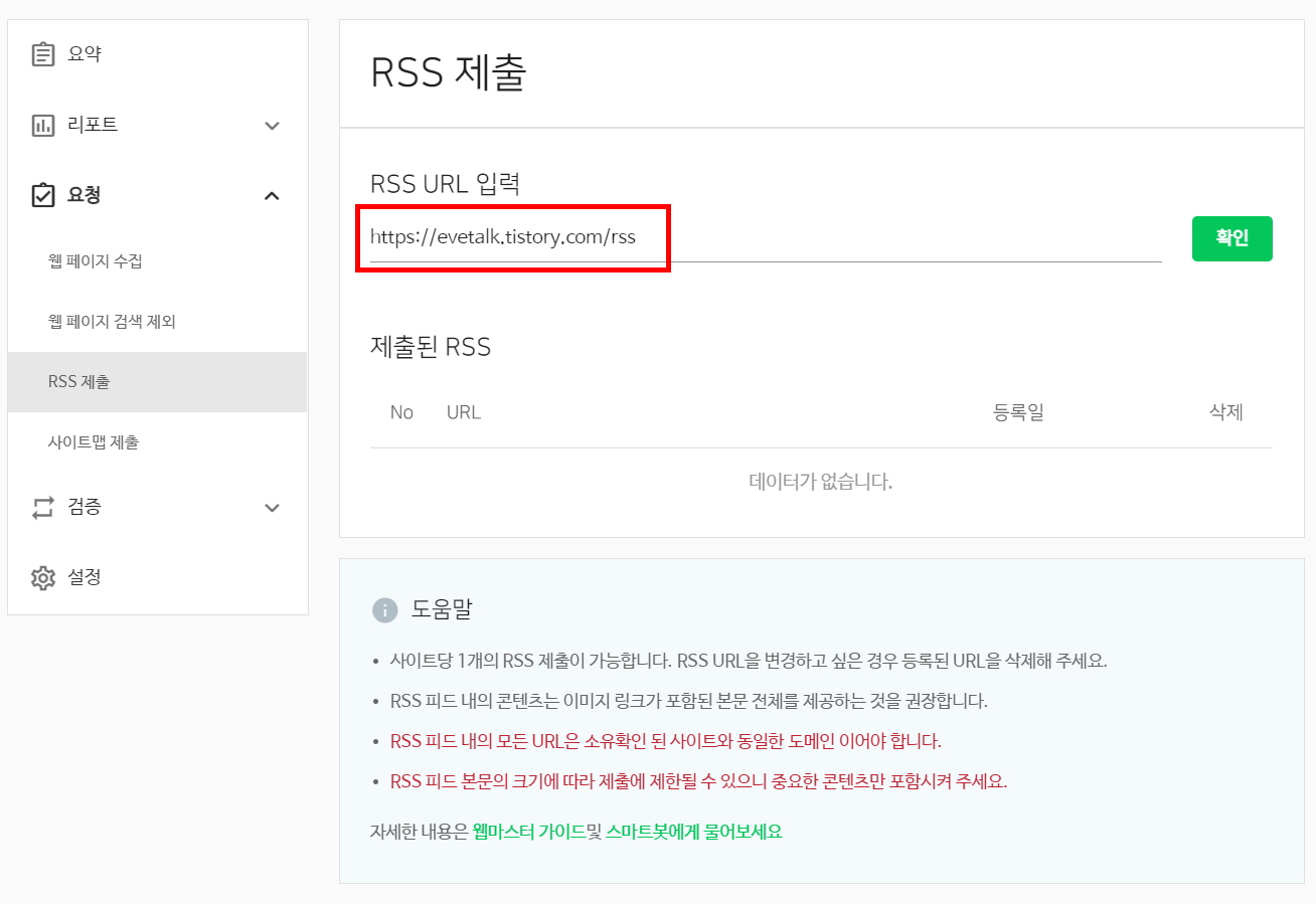 - 왼쪽 메뉴에서 [요청] -> [RSS 제출]을 클릭합니다.