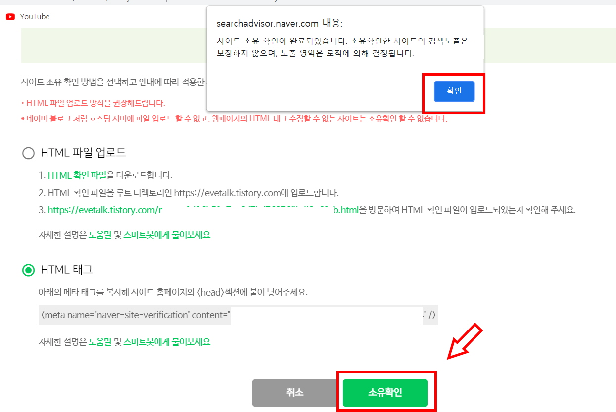 - 다시 네이버 서치어드바이저로 돌아와서 소유확인 버튼을 눌러줍니다. 사이트 소유확인이 완료되었다는 팝업 안내창이 뜨고 티스토리 네이버 서치어드바이저 등록이 완료되었습니다.